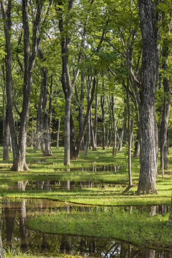 Landscapes that were originally here, but never met, mix and mingle with each other. Trees from the adjacent forest are rearranged on the site and water is drawn in from the existing sluice gate to fill countless ponds, which are all connected to the existing irrigation system with water flowing continuously at different rates. The ponds and trees are spread across the entire site at a density that is never found in nature. Moss is laid out beautifully to fill the spaces in between.