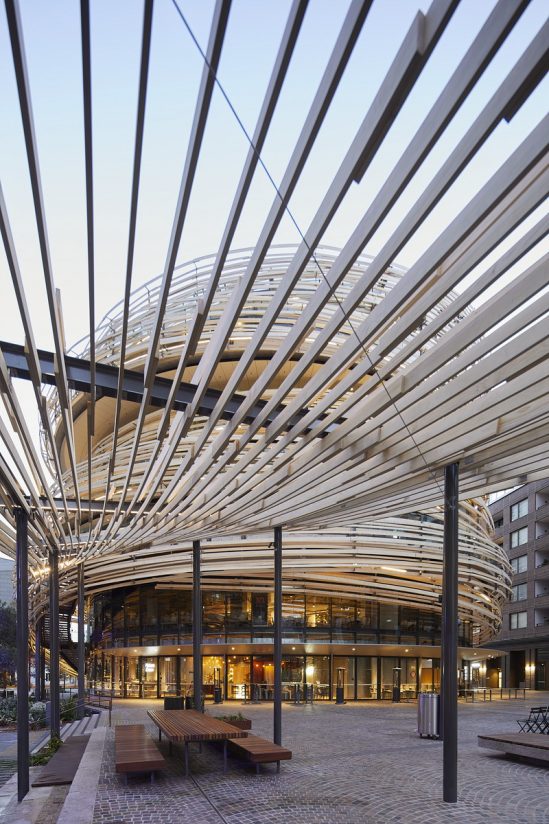 “The wooden screen wraps the exterior of the building in a dynamic and exciting manner, a historical reference to Darling Harbour originally being a hive of business activity and a focal point as a market exchange.”