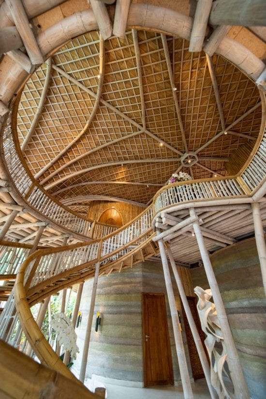“Not only is this fast-growing material incredibly sustainable, its flexibility means were able to create spaces that echo the abundance of life in the tropics. Built objects have been created which seek to biologically morph from the surrounding elements, in effect growing from the ground and sprouting among the rich vegetation. One such building is the yoga studio which literally floats from the cliff’s edge with a cantilevered structure supporting a parabolic bamboo pavilion,” explains the architects.