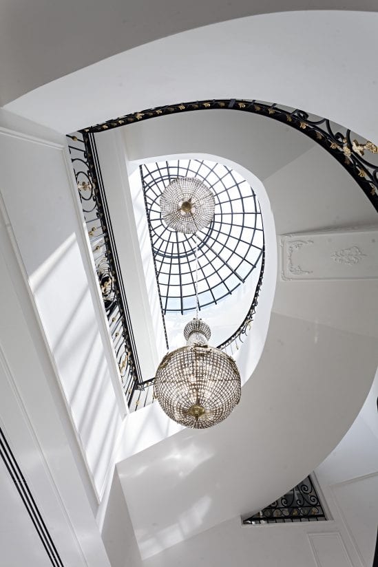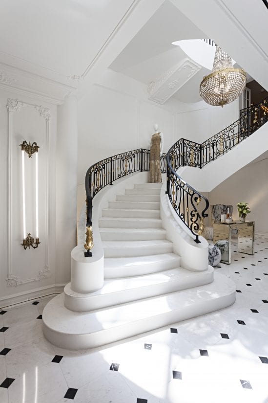 “The atelier was built with three elements in mind – the stairs, the elevator, and the skydome.  The marble and iron works that make up the stairs were inspired by the “Petite Trianon” within the palace of Versailles.  The ornate mix of iron and gold plating that decorates the elevator was inspired by Galleria Lafayette in Paris and the steel and glass skydome was inspired by the grand Palais,” explains Alexandra about the interiors of the store.