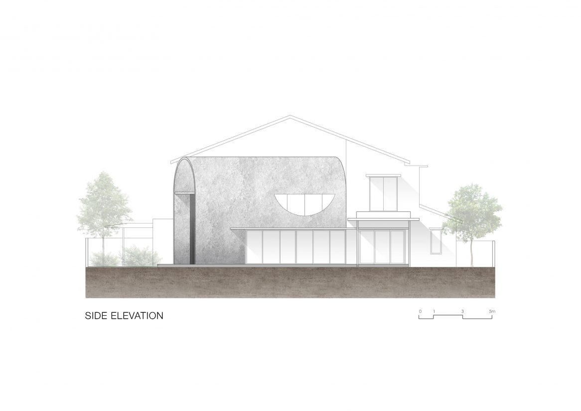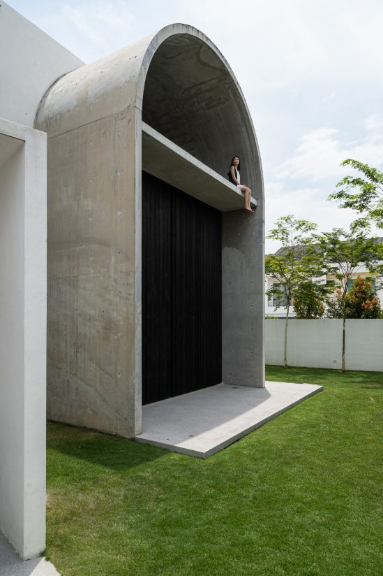 BewBoc House Designed by Fabian Tan Architect - Scale Architectural and Design Magazine“To counter the heaviness of the concrete vault, openings were carefully carved out on the upper level. For example, the inverted arch window at the side of the vault is drawn as a continuous “S” shape when it meets the front arched opening. Walking through the upper levels, this continuity echoes throughout the spaces as lines of openings and arches meet. Consequently, this rhythmic play of lines within a heavy structure lends to a play of light in subtle ways. Reminiscent of a journey through a cave, perhaps to see the light at the end of the tunnel,” explains Fabian Tan of his creation.