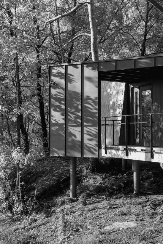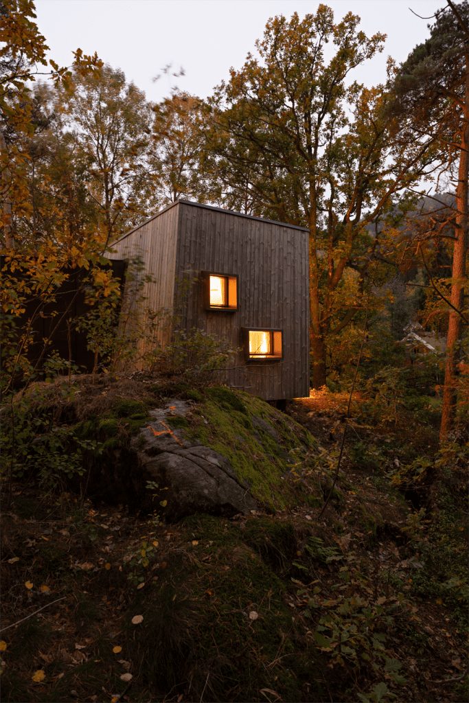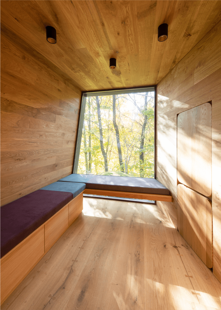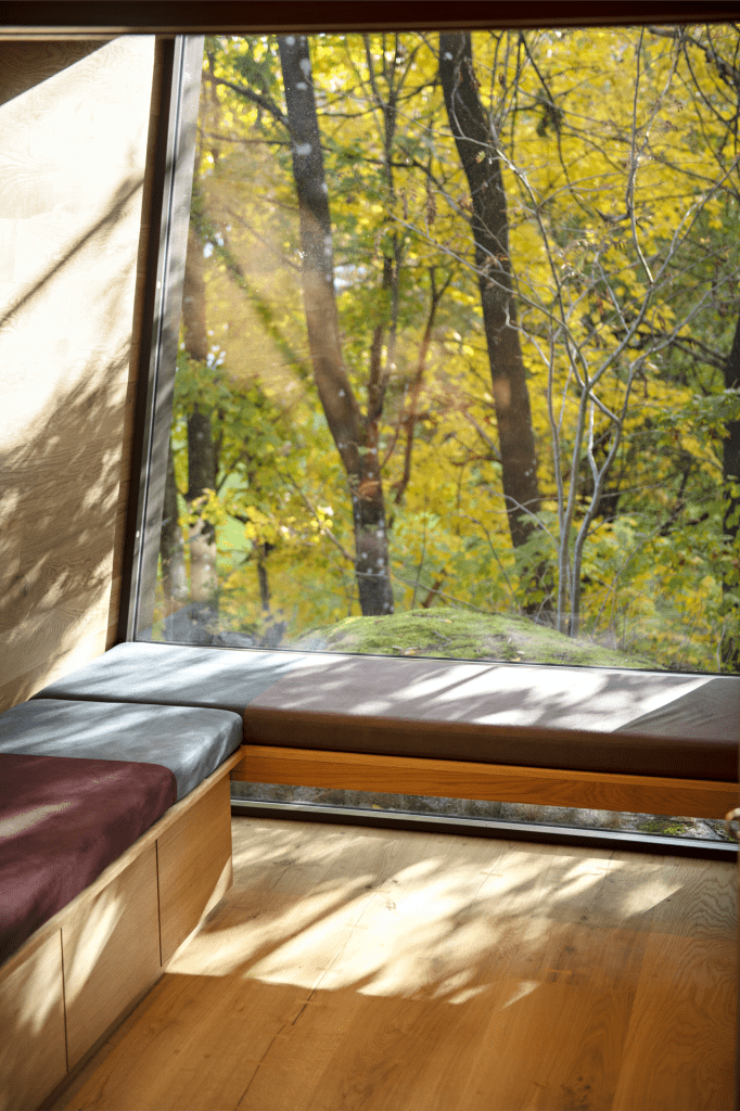 The cabin’s large glass windows can be fully opened, inviting nature into the space. In this way, visitors can peek into the woods, smell the damp forest floor, and listen to the sound of trickling water while still being inside the cabin.