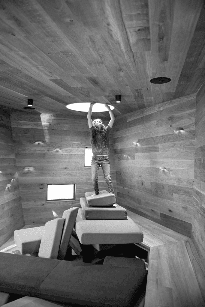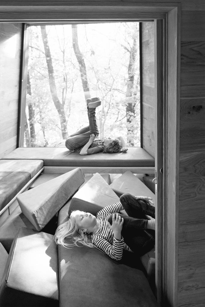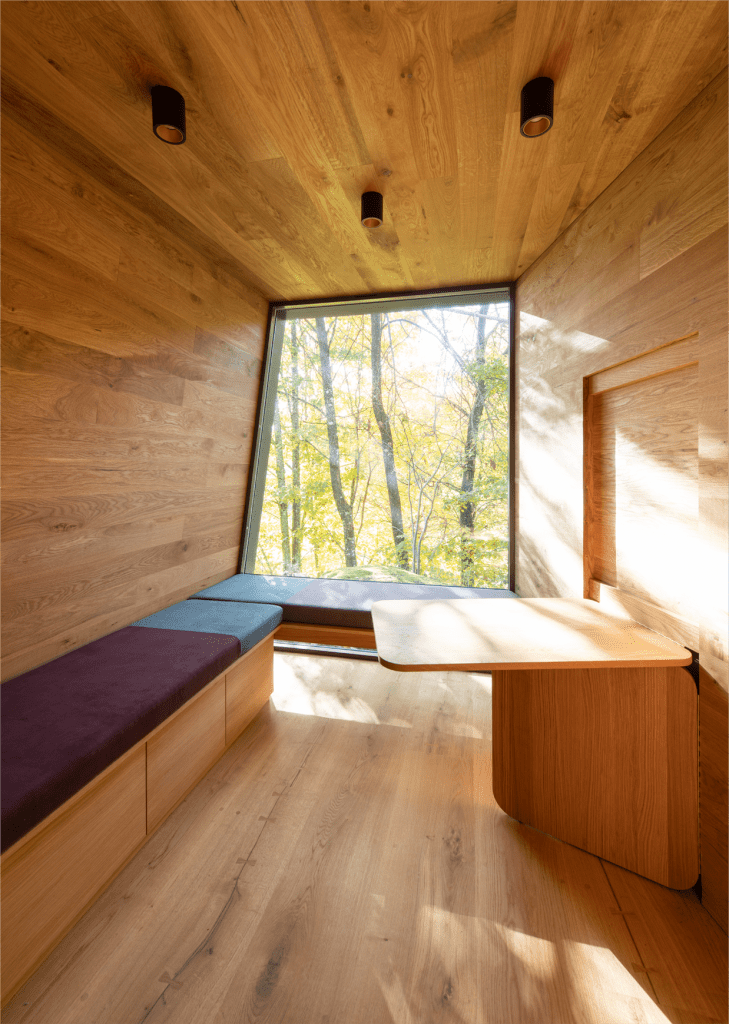 The cabin consists of a main room, a smaller room for conversation and treatment, and a bathroom. The interior is fully clad in oak, echoing the natural materiality of the woodlands outside. Inside the space, colourful, sculpted pillows can be moved around freely, allowing children to build huts or lie down to gaze at the canopies through the circular window of the ceiling of the main room.