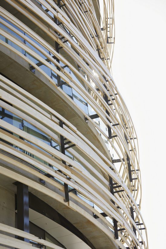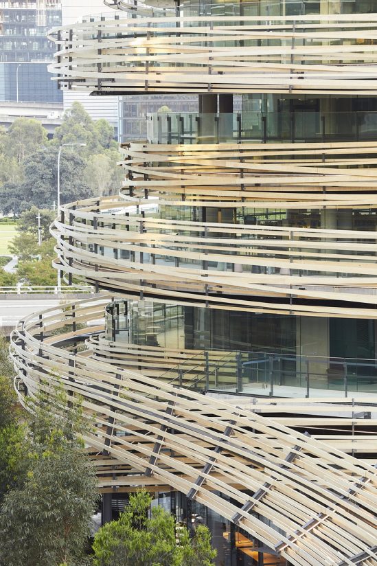 Japanese architect Kengo Kuma wraps The Exchange building in Sydney with an organic and sculptural timber screen around its shifting floor plates.