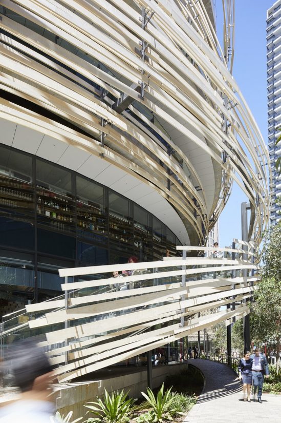 “The wooden screen wraps the exterior of the building in a dynamic and exciting manner, a historical reference to Darling Harbour originally being a hive of business activity and a focal point as a market exchange.”