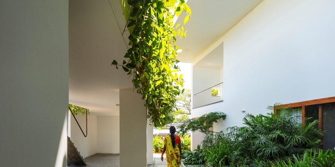 The versatility of the theatre is manifested by the layered and stepped motions of the circular plan creating a perfect balance of association and dissociation with its immediate context. The modest scale of the white walls and thoughtful articulation of curves and levels emotionally equips and encourages the children who perform there. Utilising its position as the lowest area of the site, a 70,000-litre water tank below the stage collects monsoon water which is reused to irrigate the many indigenous trees around it.