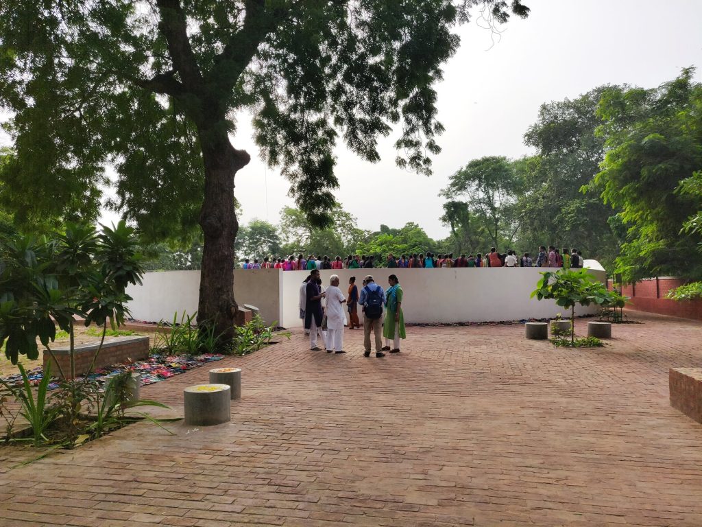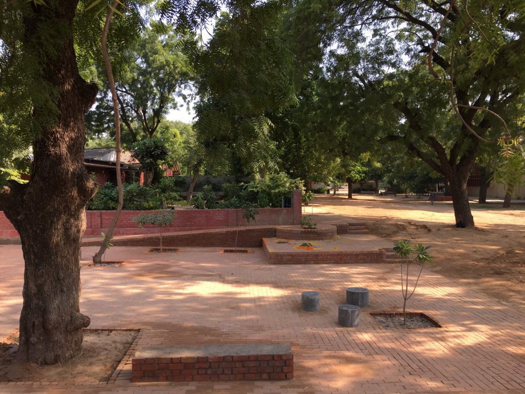 The site is marked by large old neem trees, and simple grounded structures – a primary school, Bal mandir (Madame Montessori school), teachers training college and a central kitchen. All common open spaces portray a humble and honest approach to design with the use of robust materials, clean simple design language, and a principle of coexistence with nature. Nestled within these, in a silent corner invisible from the entrance, the theatre aimed at preserving and complementing the character of the space. A peaceful walk on the meandering brick pathway, interrupted only by scurrying squirrels or sightings of magnificent peacocks, sets the mood for serene observation and introspection.