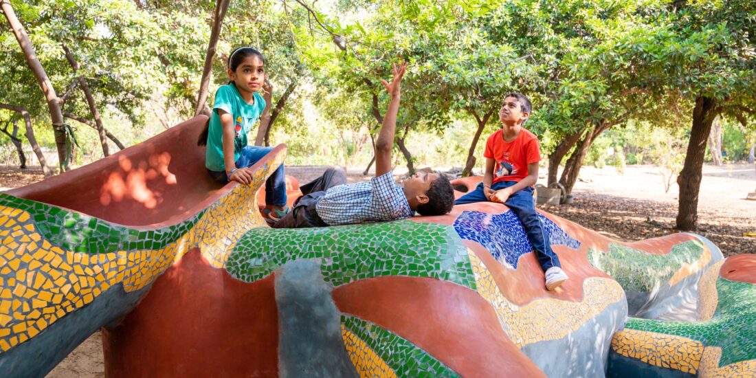 “There were four conditions put forward that triggered the design,” says Anand Sonecha, explaining the design process for the Jai Jagat Theatre, “First was that the Theatre should be simple and playful so that children would not be intimidated by it and will use it to perform and play; the second was that the environment should not be disturbed much, there were many trees that dominated the area and their importance in the design was vital; the third factor was that the structure should look as if it was always there; and lastly that the theatre should be for 300 to 350 people.”