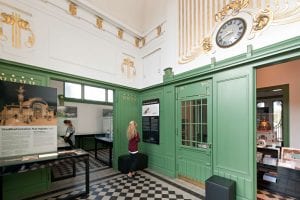 The many decorative details make the station into a prime example of Viennese art nouveau. Metal and wood were painted apple-green, the signal colour of the Stadtbahn. Gold, and finest white marble were added on the exterior.