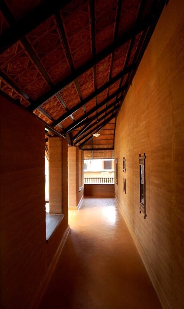 Rammed Earth construction was used to build Dr Achyuth Sankar’s home and it involves compacting a damp mixture of soil that has suitable proportions of sand, gravel, clay, and stabiliser into a formwork to give the required shape. Image Courtesy @Bhoomija Creations