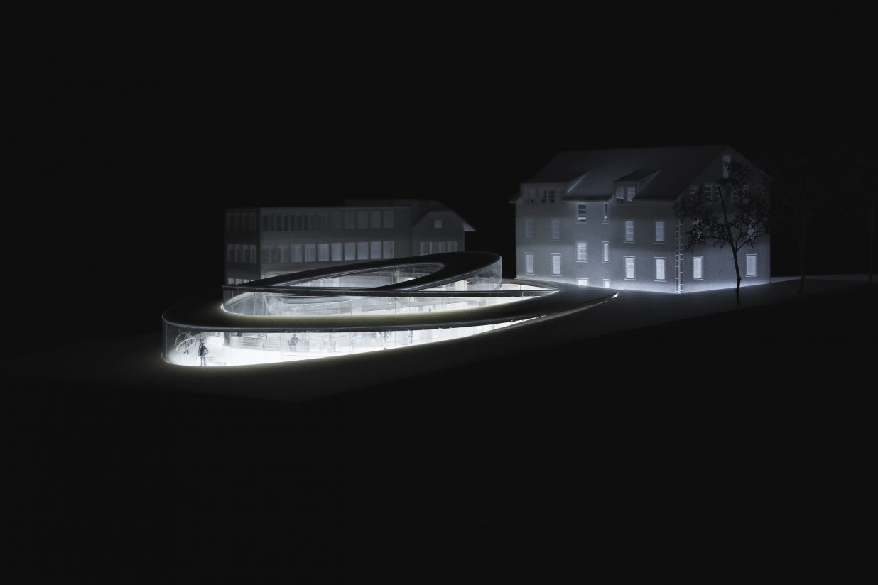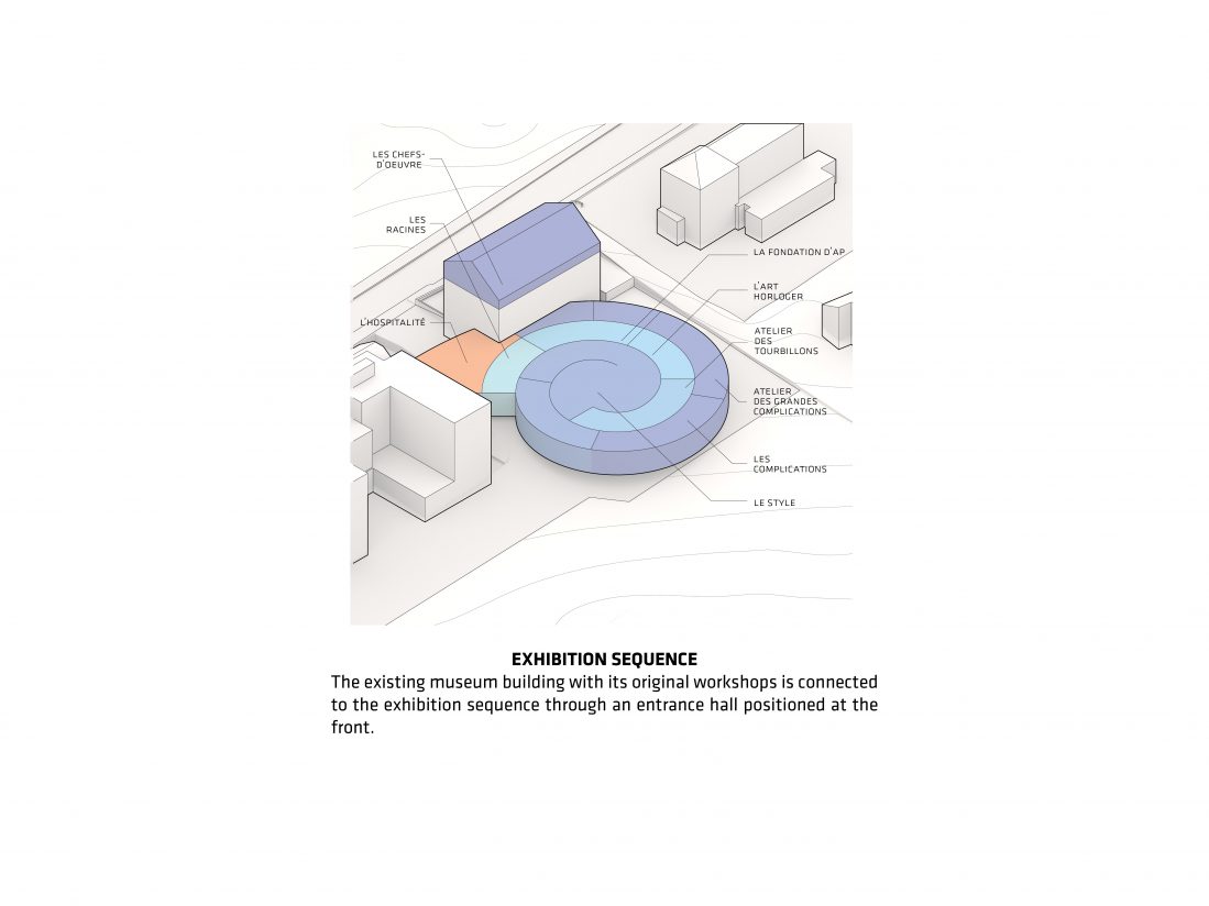 Musée Atelier Audemars Piguet is conceived as an oxymoron, according to Bjarke Ingels of BIG (Bjarke Ingels Group). Striking yet subtle. Contemporary yet timeless. Functional yet sculptural. Floating yet rooted. Local presence with a global resonance. A striking landmark that is seamlessly integrated in the local landscape. A contemporary yet timeless architecture that blends with the historical buildings to create an intuitive sequence of spaces – old and new. A pavilion for the art and science of watchmaking that is conceived as a story-line for the visitors – every element is governed by the functional requirements of the exhibition, while appearing as a striking sculpture conceived in a single gesture.