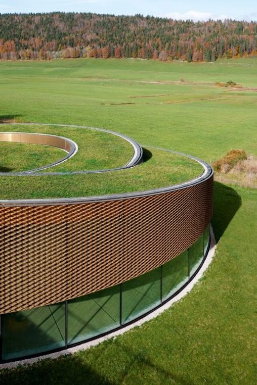 The buildings organization and architecture embody the core values of Audemars Piguet. Curved walls and green roof sitting cozily on the landscape, the building is nested in the nature and culture of the place and the people of the valley.