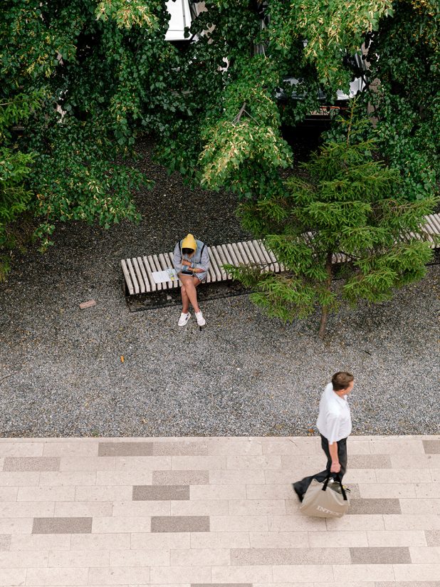 DROM designed peculiar paving patterns for each of the squares and integrated spaces that are protected from the strong crosswinds and sun by strategically placed “hills” and local species of linden, red maple and blue spruce trees.