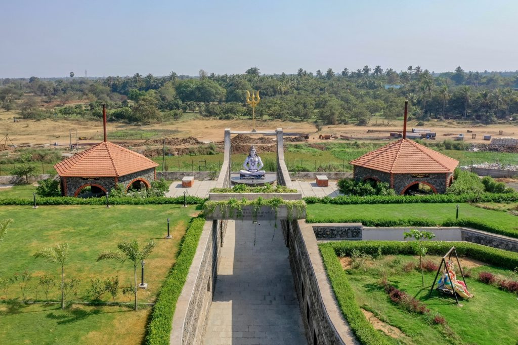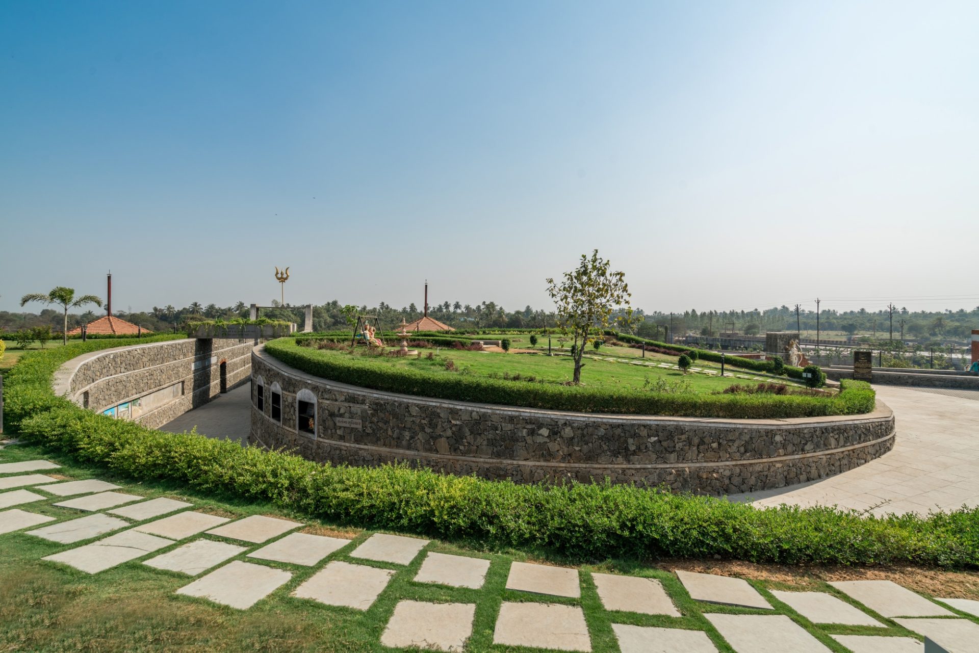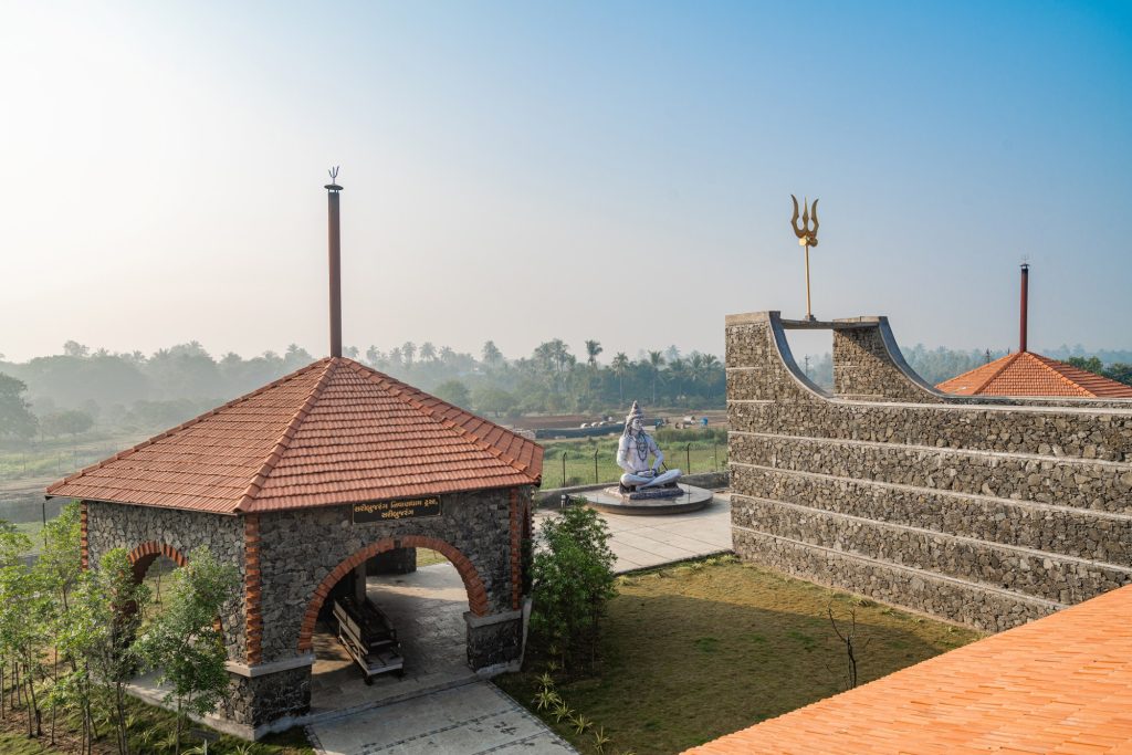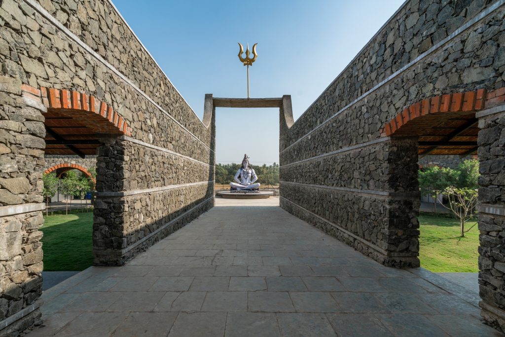 In the middle of the journey through the ramp, a bridge with overhanging creepers connecting the two gardens at the upper levels emphasises the sense of being grounded in peace and stillness. The curvilinear ramp then surprisingly reveals a grand sculpture of Lord Shiva which is not visible from the entry level. “According to Hinduism, Meditating Shiva in a crematorium speaks of aloofness from materialism and the constant understanding that one has to die and be reduced to ashes. It recognises the world and encapsulates it in the philosophy of creation, sustenance and destruction — symbolised by the God’s weapon, “Trishula”. To accentuate this, the idol of the God is visually framed with elevated stone walls and the end of the ramp is marked by the slab holding up the golden trident,” says Patel.