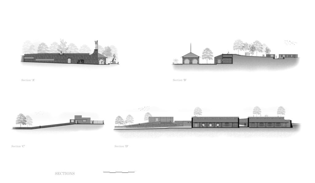 The sunken courts at the lower level allow only a controlled relationship with the exterior, enabling a tranquil atmosphere for reflection and remembrance for the mourners. Two hexagonal-shaped cremation pyres arranged symmetrically are separated by the ramp allowing the possibility of conducting two funerals at the same time with a sense of privacy.
