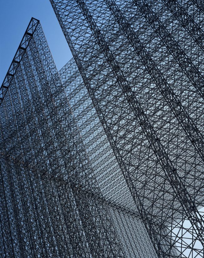 Each portal’s remarkable appearance comes from being woven entirely from strands of ultralightweight carbon fiber composite that lend incredible structural strength. This enables the ethereal portal structures to stand 21 meters high and 30 meters long, without any additional support. From afar the portals appear to be composed of translucent planes, which up close visitors discover are made from hundreds of fine lines of a structure.