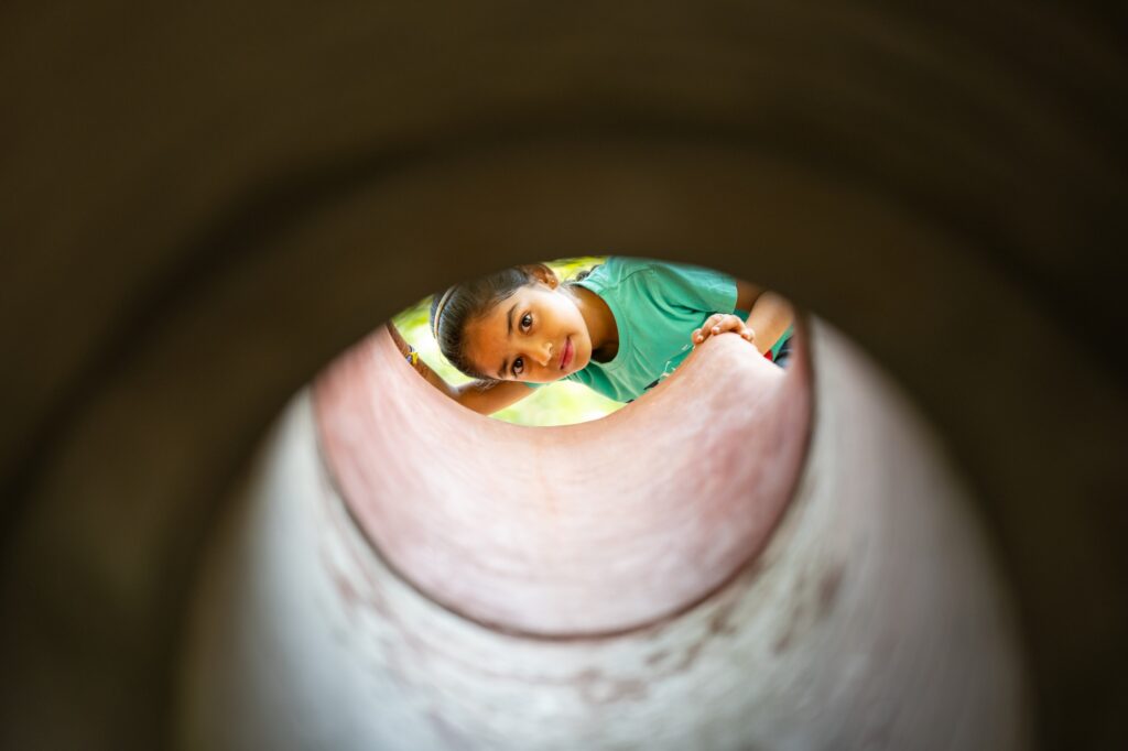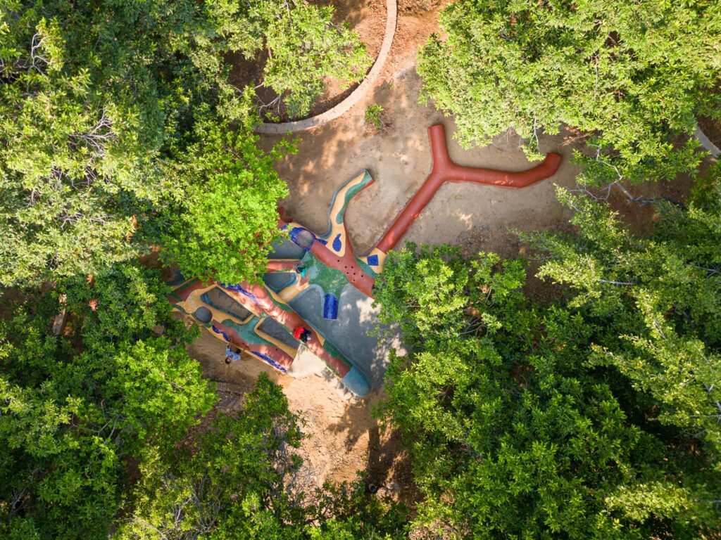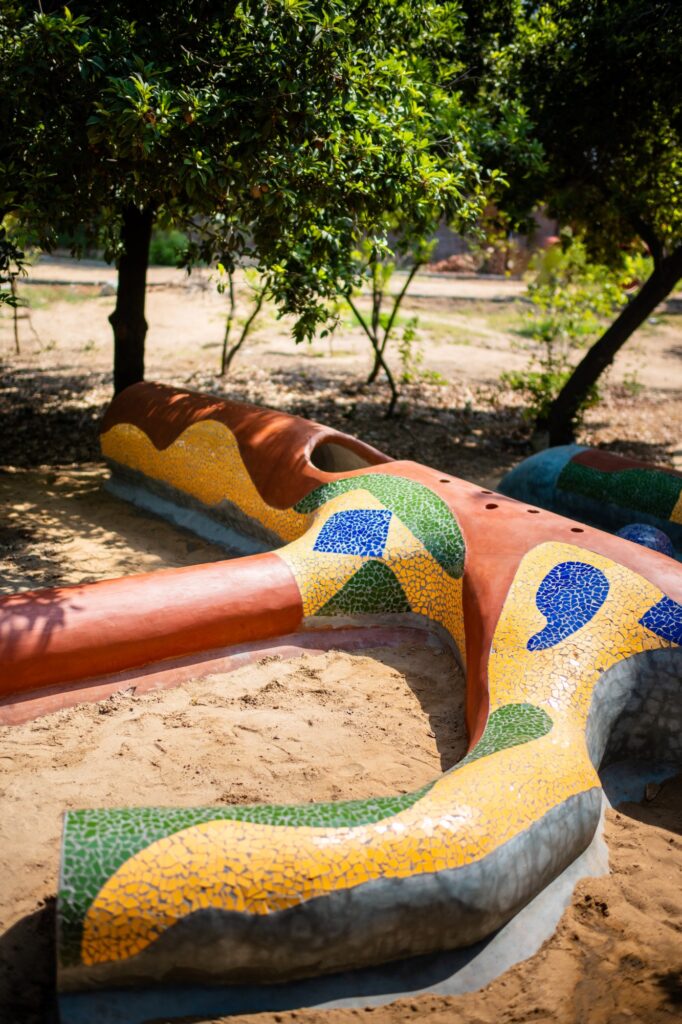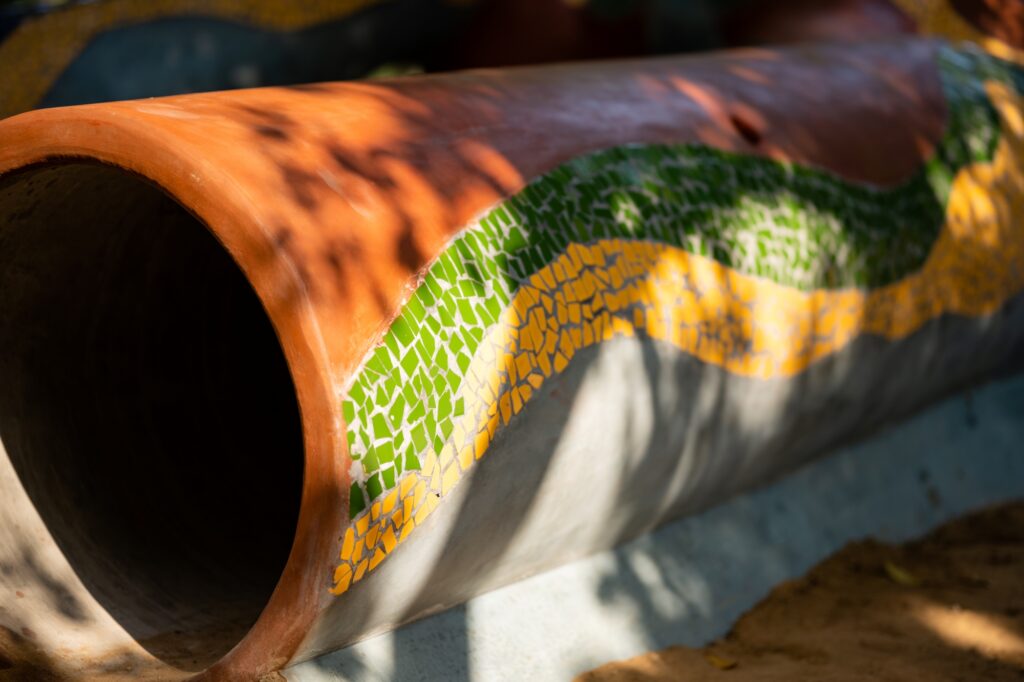 The focal point of the playground is undoubtedly the tunnel space, a whimsical creation fashioned from repurposed concrete pipes and adorned with vibrant mosaics. This magical passageway sparks the imagination, inviting children to explore its cozy confines and ignite their sense of wonder.