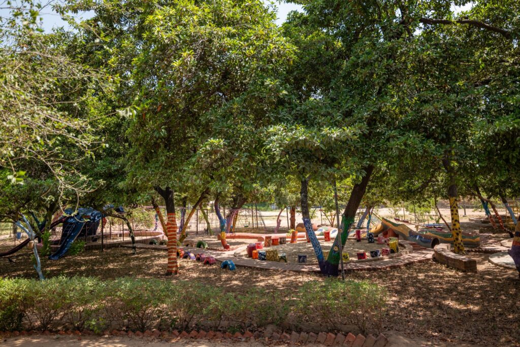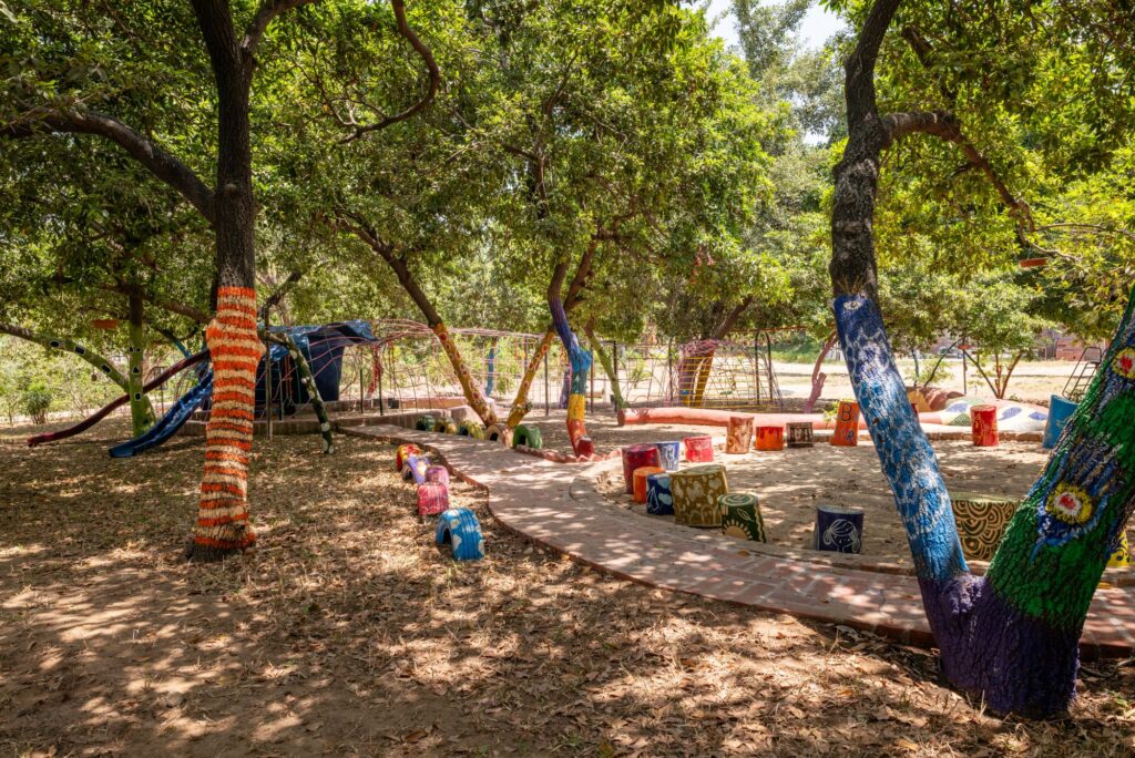 The playground is divided into five zones, each fostering unique sensory and imaginative experiences: Water Zone: Encourages sensory exploration and tactile learning; Sandpit: A creative canvas for imaginative play; Play Gym: Crafted from recycled materials, it combines child-friendly designs with sustainability; Tunnel Space: Repurposed concrete pipes adorned with vibrant mosaics spark curiosity and adventure and a Collaborative Spaces: Areas where children contributed directly, painting tree trunks, tires, and other elements, fostering a sense of ownership.