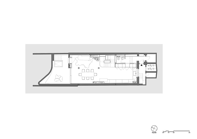 With the rear extension, the dining room features a direct visual link to the garden through the light-weight glass extension. Panoramic sliding doors open towards a generous terrace shaped by the presence of a large walnut tree. Here, the walls are cladded in glass-reinforced concrete panels (GRC) that fold to form a curved bench and the stairs to the garden, creating a visual connection with the dynamic lines of the interiors, which is continued in the design of the planters’ edges in the outer part of the garden.