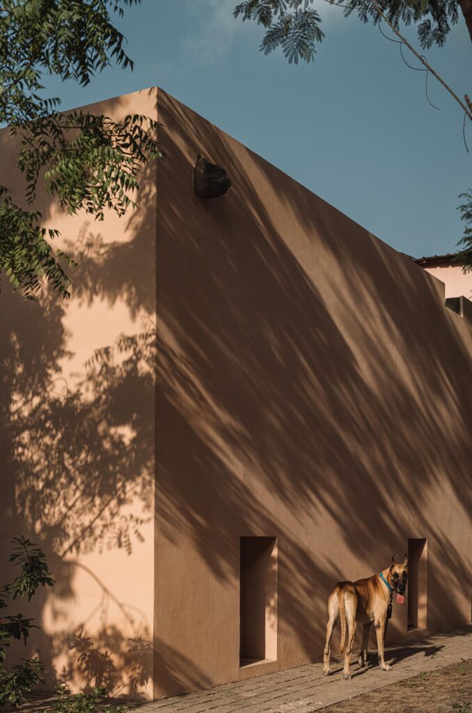 In Mana, even the furniture carries memory. Dhawal sourced mid-century Danish chairs from Alang, Gujarat’s ship-breaking yard. Scattered throughout the site are small gargoyles, cast in the forms of a cat, a cow, a dog, and a monkey, perched along the parapets.