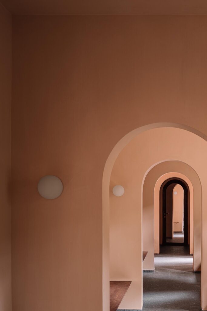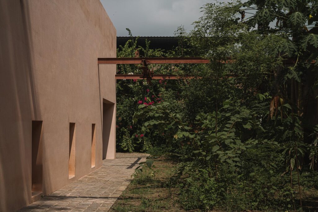 Inside, restraint defines the palette. The dark granite floors ground the space, while teak wood introduces a quiet warmth against the pink plaster. Along a long corridor, a series of arches punctuates the linear plan, turning what could have been a static, narrow building into a rhythmic sequence of spaces. The principal architect’s office sits at the quiet end, connecting to a small, concealed courtyard.
