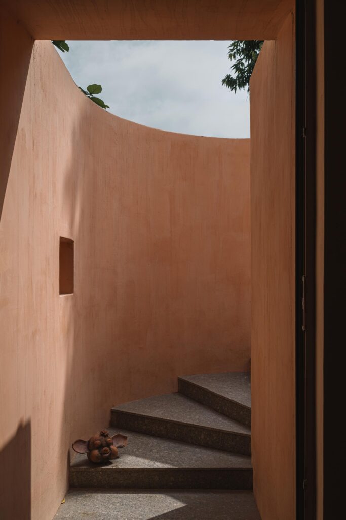 The site, bound by towering compound walls ranging between 4.5 and 6 meters, conceals the studio from view. Inside, however, the transformation is startling. Lime-plastered walls in muted pink greet the visitor, a single, monolithic expression that contrasts sharply with the surrounding industrial greys. The absence of an obvious entry adds intrigue.