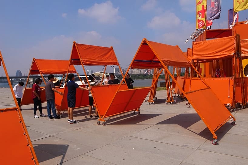 “The Bamdokkaebi Night Markets are collapsible and stackable structures used to host two design markets on the side of the Han River. The facilities only operate during weekends and for this reason, the booths had to be easy to store, move and deploy. The project provides two practical and iconic solutions for two different locations: Yeouido and Banpo,” explains Marco of one of the designed markets.