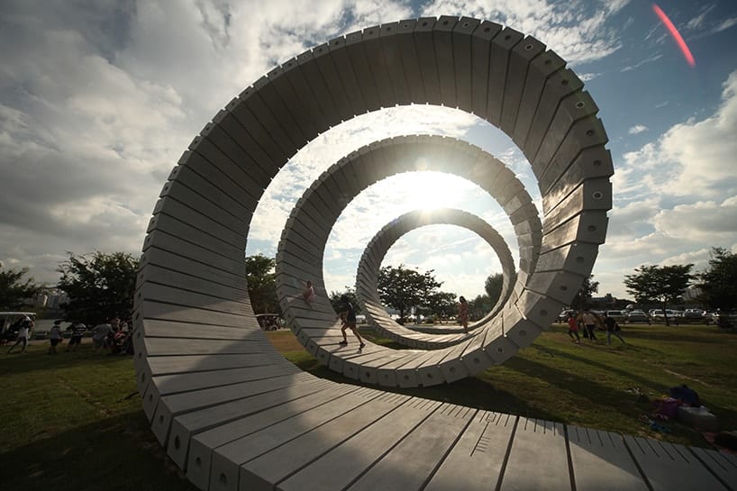 The Scroll is the main pavilion of the newly open Hangang Art Park, an open-air collection curated by Eun Byungsoo that includes 37 new public art pieces. The 3 loops structure welcomes the visitors with performing areas and areas to rest while providing a key to navigate through the Art Park.