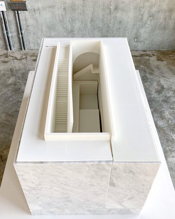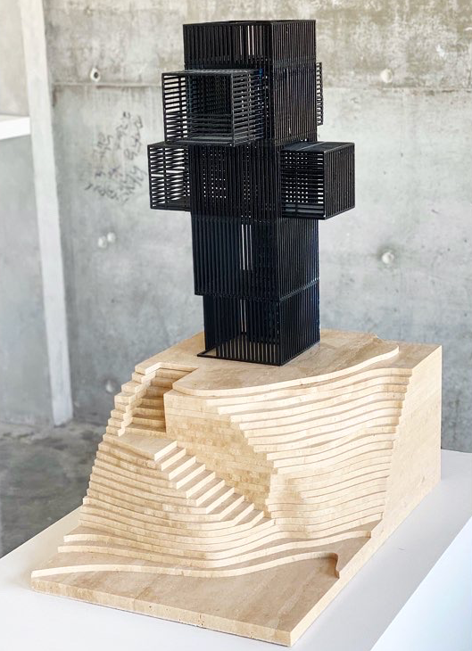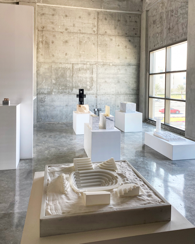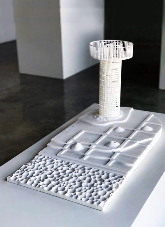 - The Salt Tower, exhibited on the first floor is the result of one such thought that troubled the architect; Qatar’s vast amount of desalinated sea water, a process that requires litres of oil per each cubic meter of treated water. The design is surrounded by a salt farm, which provides the raw material – the bricks – that make up the bulk of the walls.