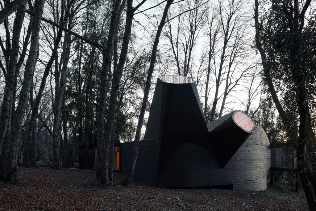 Carbonero House occupies the landscape between the forest and the sea. Constructed from timber and blackened mesh, the ephemeral volume appears suspended. Its dark, porous envelope absorbs light rather than reflects it, dissolving mass into atmosphere and allowing wind, shadow, and sound to enter the architectural experience. Carbonero proposes architecture as provisional shelter, attentive to climate, terrain, and time. Photo courtesy of Smiljan Radić