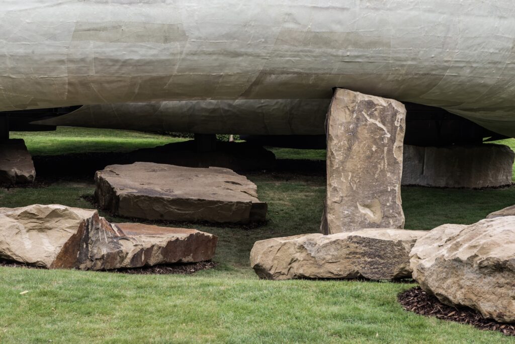 Serpentine Gallery Pavilion presents shelter as a seemingly-suspended condition. A translucent f iberglass shell appears to hover above the lawn of Kensington Gardens, resting improbably on a ring of immense load-bearing, locally-sourced stones. Photo Courtesy Iwan Baan.