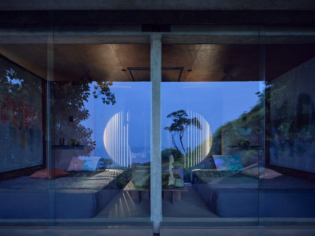 Every gesture in the home draws the inhabitants outward: a hallway drenched in red-gold sunset light, a shower with direct views of the ocean, a rooftop perch for stargazing. Studio House is less an object in the landscape than a frame for the endless theatre of the jungle and sea.