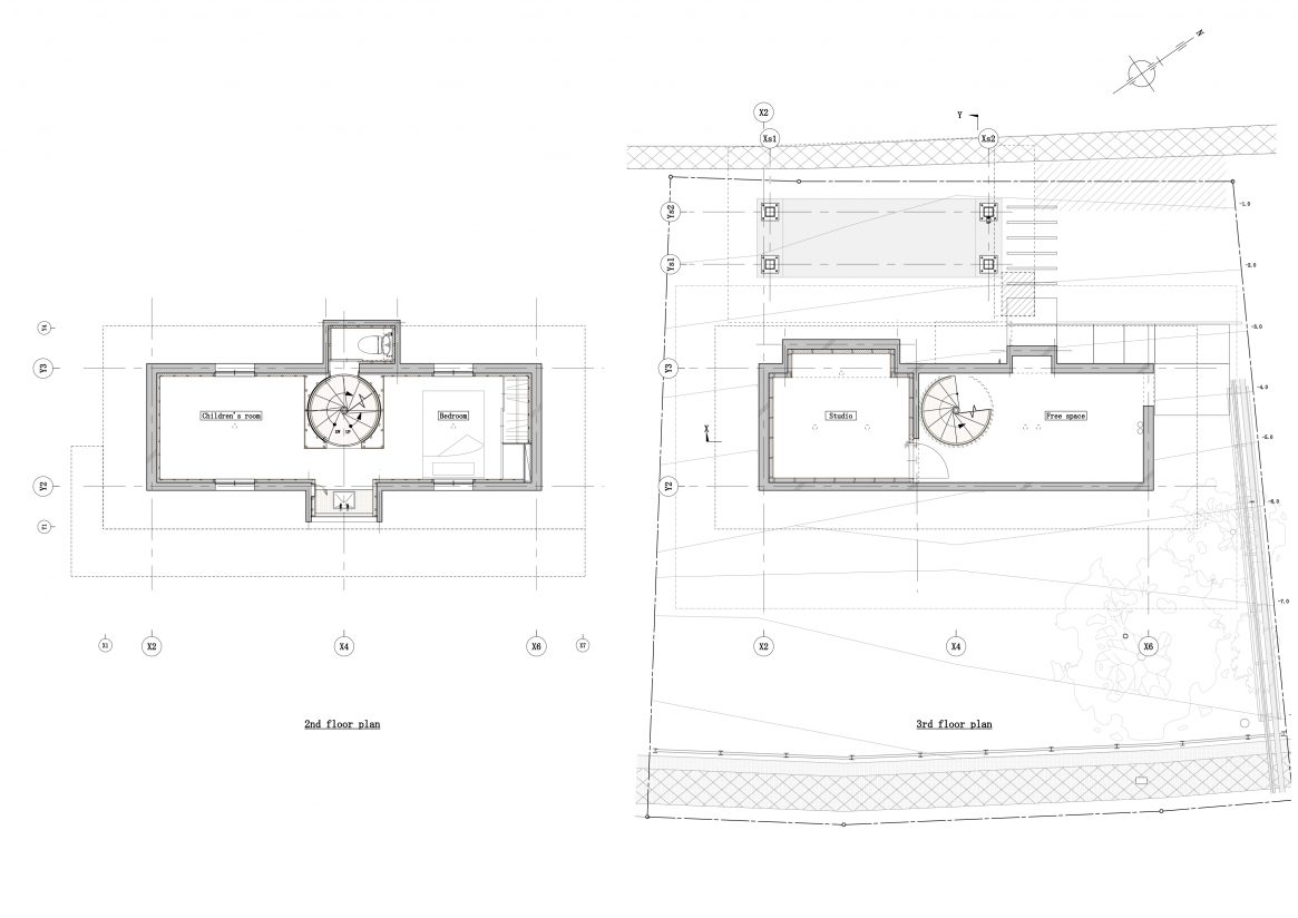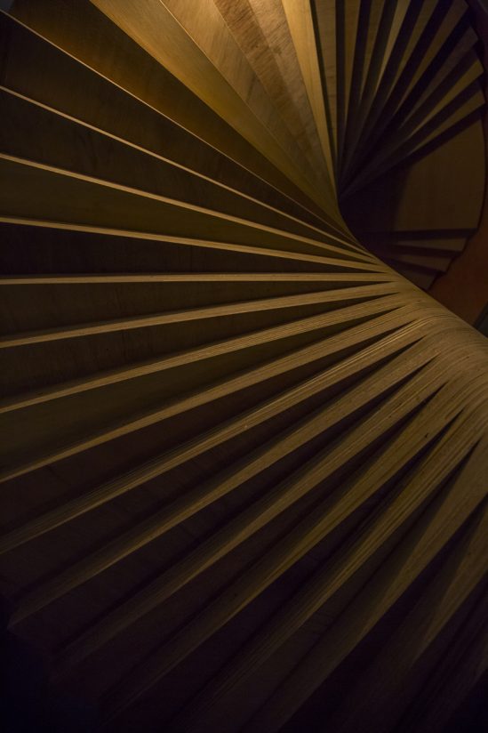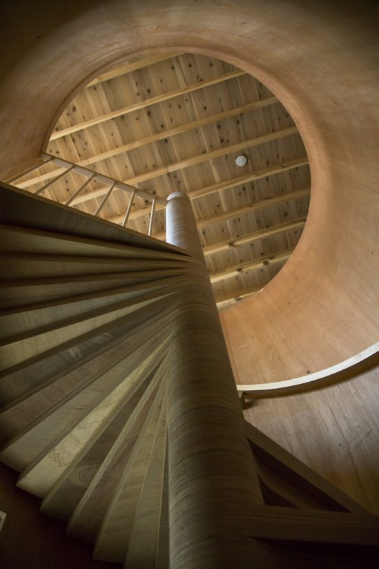 A beautiful cedar circular staircase is as much an architectural feature as it is a functional one. Each of the furniture in the house is designed for the house and like the structure, is functional and without frills, letting the material take on the role of aesthetics. Raw wood in the main living room add to the character of the house. This is one house that is entirely mimicking its functional aspects with its material being the only additional frill, and the simplicity and warmth of wood contrasted with the cold-structural concrete add to the particular beauty of the residence.