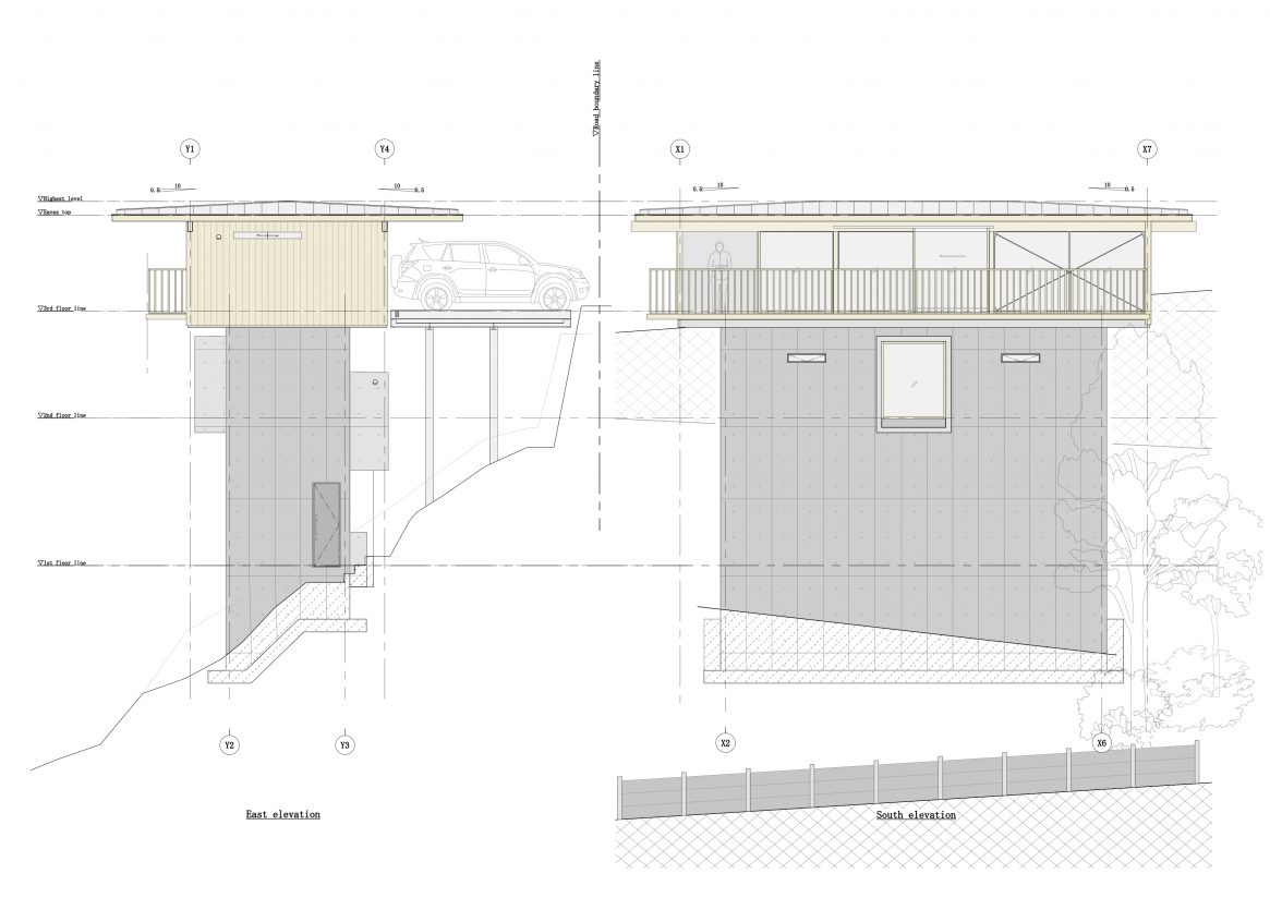 The finish on the first and second floors is exposed concrete both inside and outside, while the structure and finish on the third floor is all cedar.