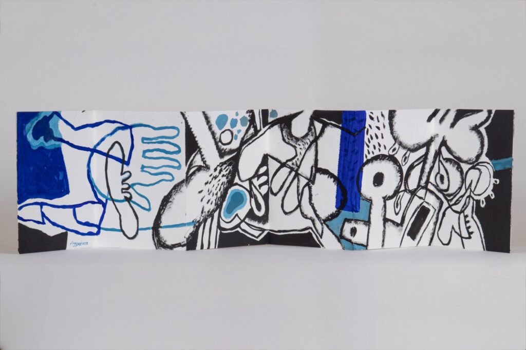 The idea was born from a quotation from artist John Baldessari, which said, “It is difficult to put a painting in a mailbox.” Taking this quotation as a challenge, artist and creator Al Kadiri mailed books to artists in 22 cities around the world to solicit their creative expressions. And thus created 59 handmade, hand-stitched books with bespoke covers designed by Reza Abedini, created in-house at Dongola. Each one of the handbooks has a work completely different from the other yet every work explores the mental condition of the artist in this difficult period as they hoped for a better tomorrow.