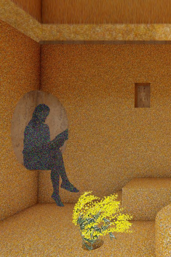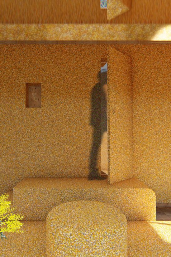“The installation is a space for rest, reading and self-reflection; moments to be mindful and present. Niches are integrated within the structure to store the essential objects of our daily life. A window is the focal element of the space, highlighted by a small stairway, to day dream, embrace our mother-nature, needless to say its healing, restorative and inspiring powers,” explain the co-founders.