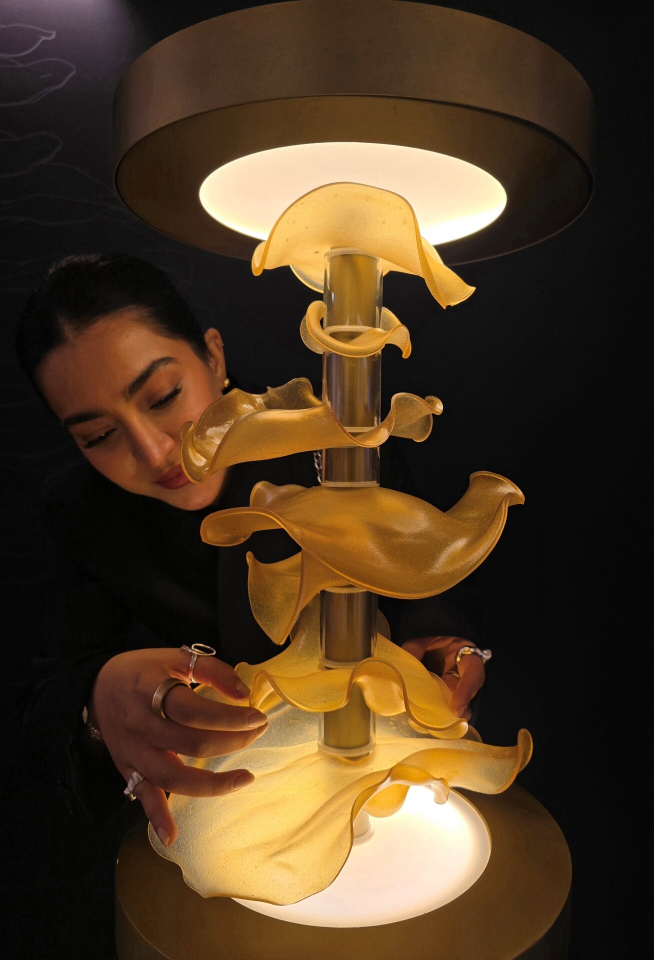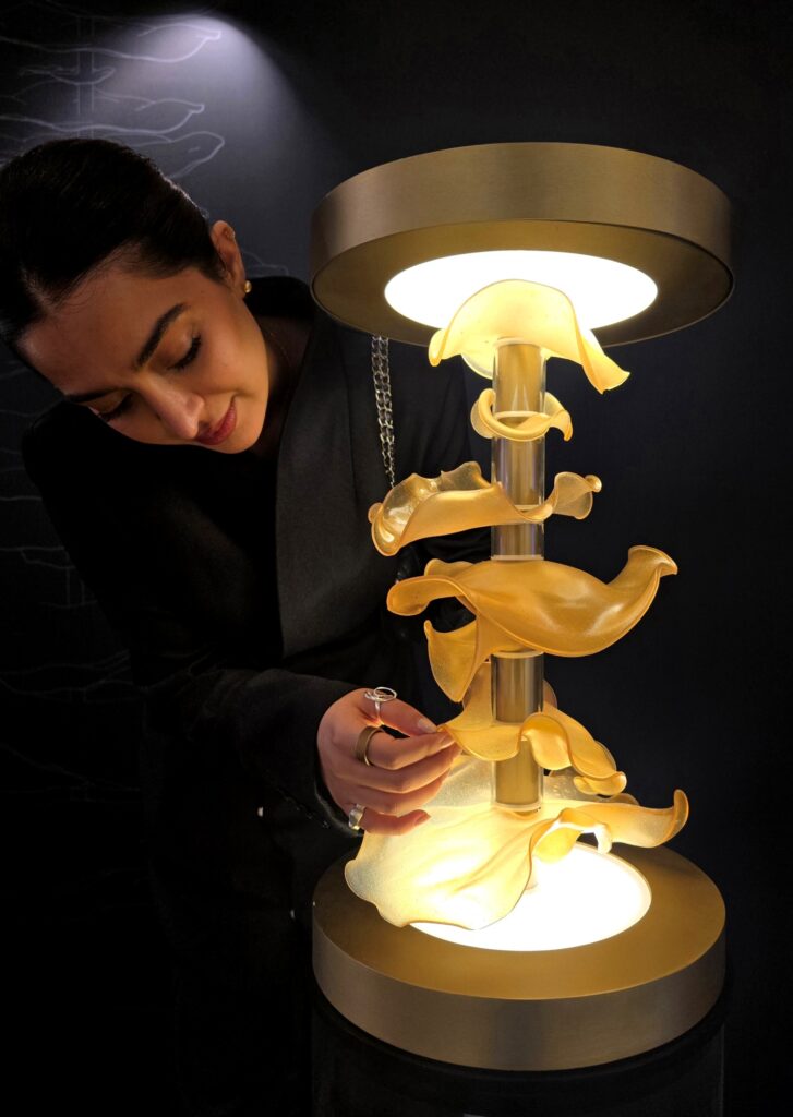The material’s malleable property allowed Shaikhi to control the thickness. Once cured, the sheets were shaped into undulating disks, and assembled withing a metal framework. The final product possesses an almost gossamer, luminescent quality, diffusing a warm, muted glow.