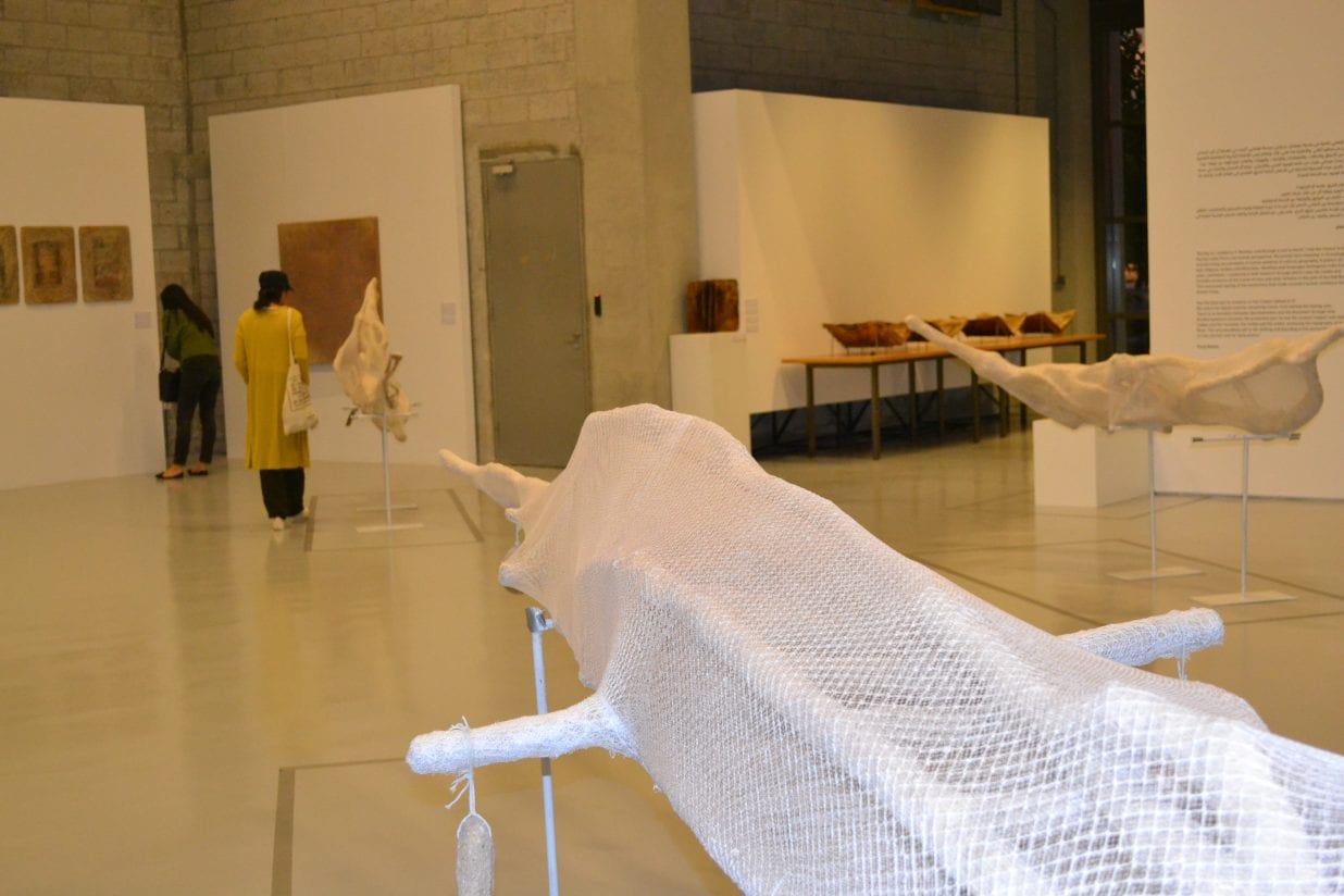 Faraj’s exhibition thus addresses the concept of historical concealment and exclusion through a qualitative approach between what is visible and what is real. During his residency, Daham relied on local tangible and intangible materials to create artworks. Such materials include the fishing nets from Kochi, which he used alongside handmade manuscripts to hide the intangibility of history.