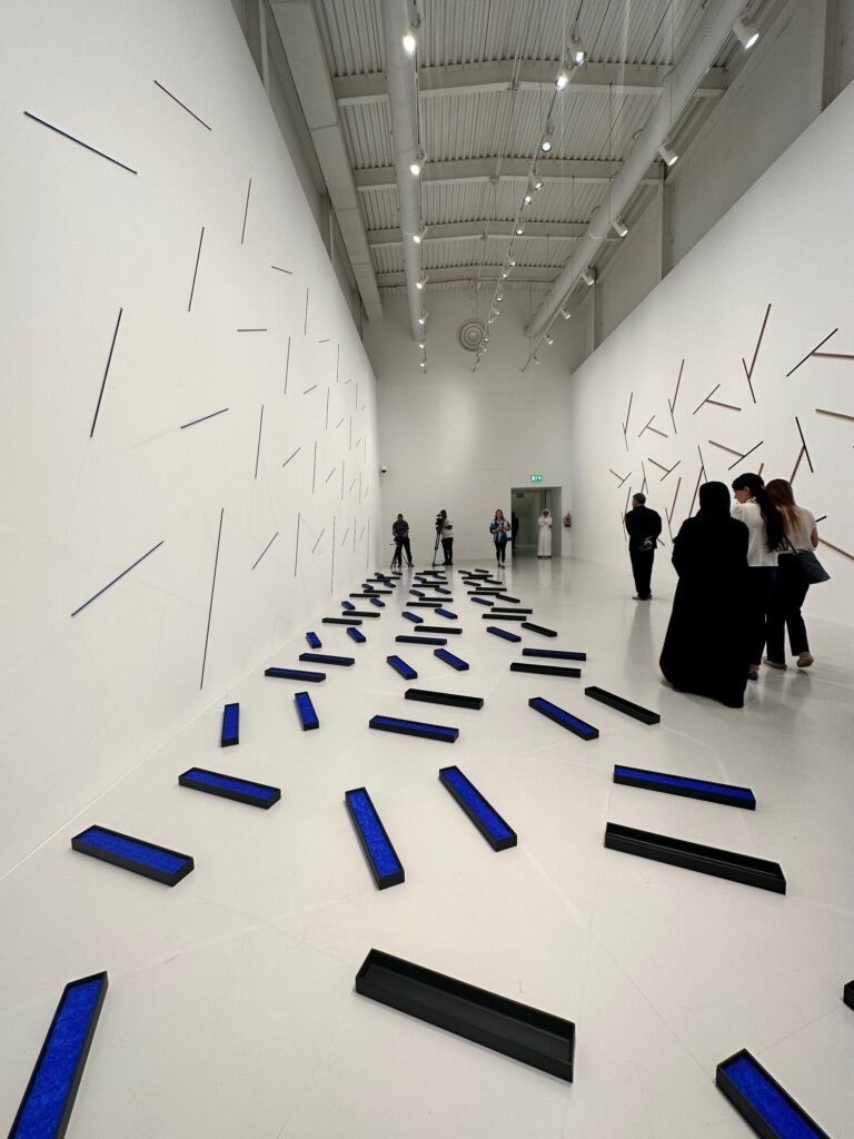 “In this room (Moutashar’s exhibition) you are surrounded by two walls that wrap around you and evoke the traditions of early Arabic calligraphy. The words seem to float around you as they are placed strategically in a white backdrop, elevating the floating experience,” explains Alsaden.