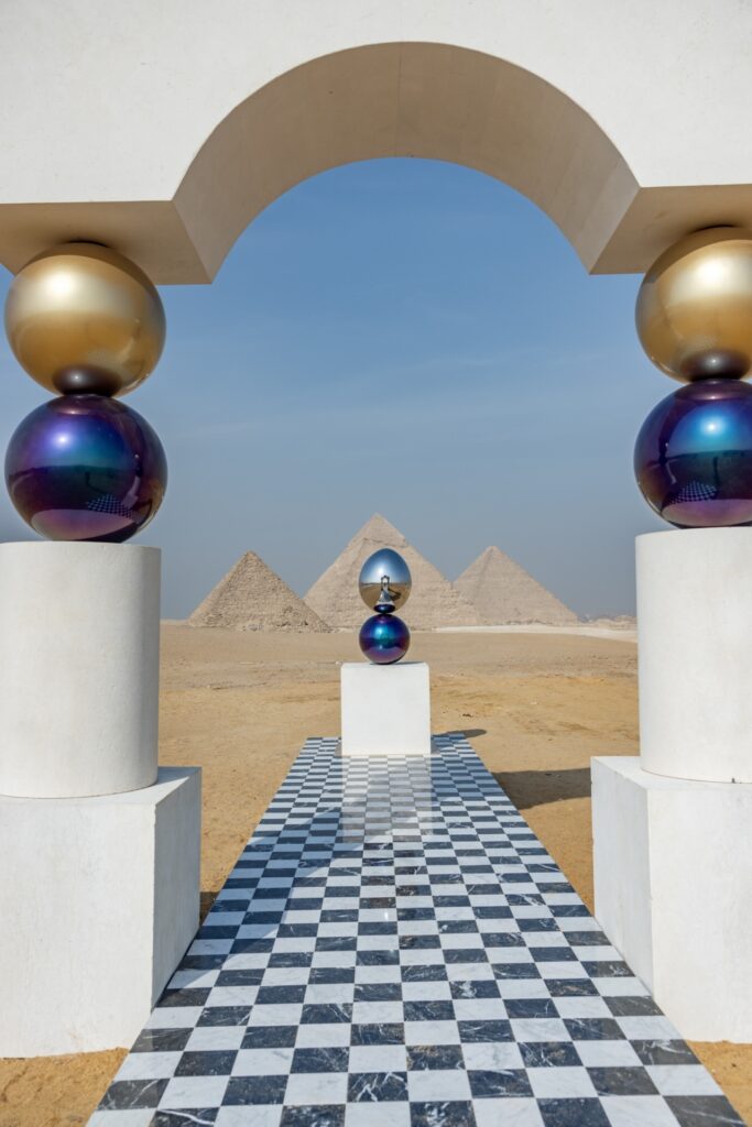 Argentinian artist Pilar Zeta introduced her artistic project “Mirror Gate,” stating that it was inspired by her fascination with Egyptian culture and the ancient mysticism in Egypt. She considers this gate to be significant, serving as a multidimensional portal connecting past and present, blending natural and artificial materials from the post-industrial era. She invites viewers to reflect upon their infinite potential when they see their reflections inside the pyramids, drawing connections to the limitless possibilities found in Egyptian mythology.