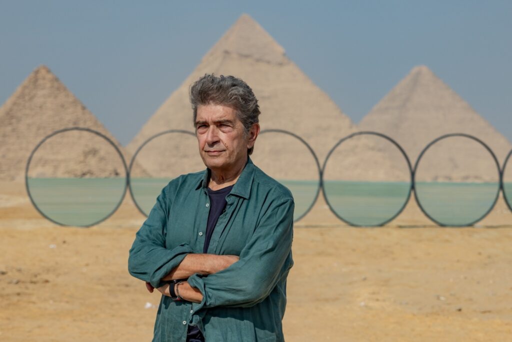 The Greek artist Costas Varotsos participated with his project “Horizon,” which focuses on the relationship between the Nile River and the Giza Plateau, emphasising its significance for the world. He says, “This new horizon is defined through eight circles in which the world revolves. The celestial dome and the cycle of life expressed through the geometric shape of the circle are concepts related to the engineering of the pyramids and their history. The importance of the artistic work is to establish a connection between all the natural elements of the surrounding area. For me, the horizon has always been a prediction of the future, towards something coming, defining the concept of the horizon in space, but at the same time determining the position toward life.”