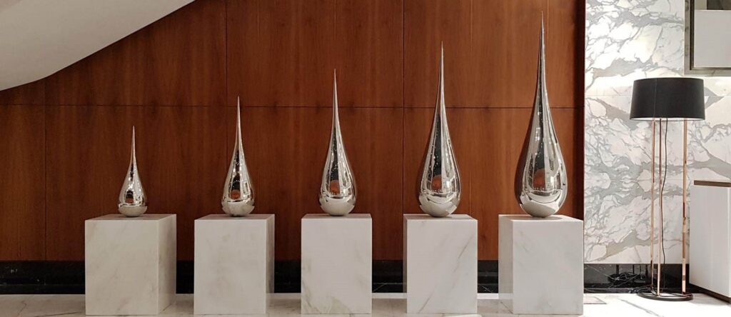 The Drop, an installation by my late father, Ali Ghaddaf, featuring meticulously forged stainless steel droplets with a mirror-like sheen.