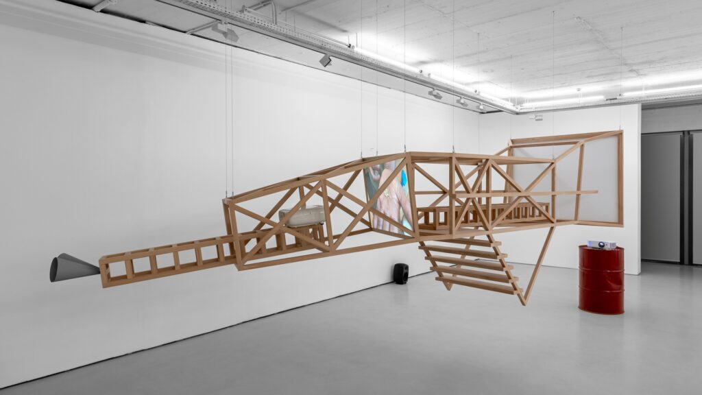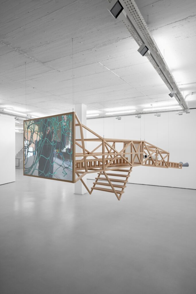 SCALE: The installation consists of a wooden tower that seems to have fallen over.