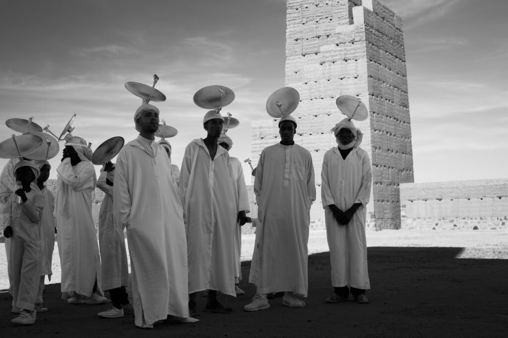 Paraboles also features Gnawa, a Moroccan musical tradition evolved from the descendants of slaves. Thanks to the cast and crew, the film’s set brimmed with song and dance. “The breathtaking landscape with Hans Voth’s celestial architecture lent a sanctuary-like quality to the setting, immersing us in a unique universe,” Hiba added, referring to the monumental land art structures created by German post-war artist Hannsjörg Voth in the Moroccan desert.