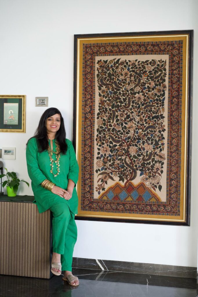 Cover Image: Yosha Gupta in her home with a Tree of Life Kalamkari Artwork, hand-painted by Siva Reddy