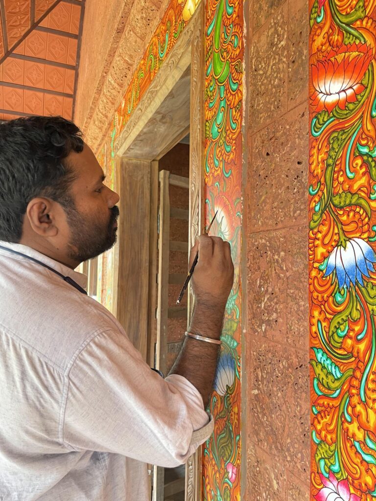 Master Artist Adarsh hand-painting Kerala Mural Motifs for a wall mural project
