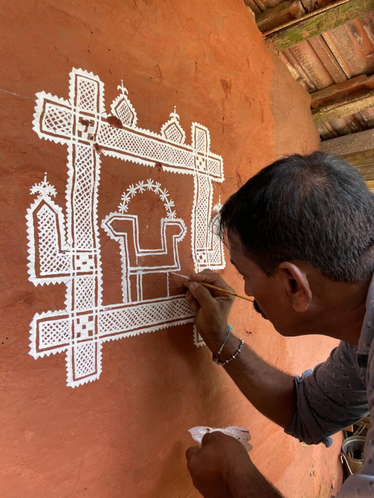 Master Artist Ishwar Chittara hand-painting Chittara on the wall and showcasing the traditional techniques of Chittara Painting of Karnataka