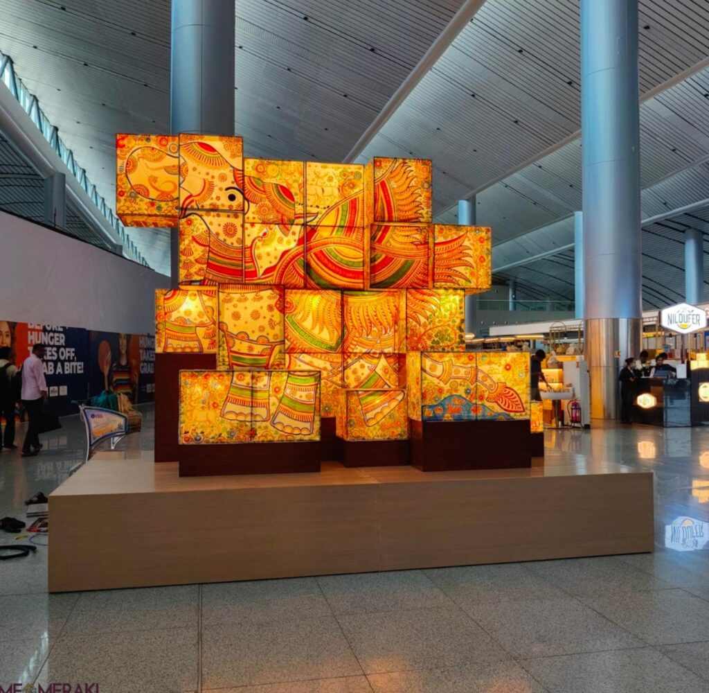At MeMeraki, we’ve poured our hearts into creating cultural experiences that honour India’s artistic soul. At GMR Hyderabad Airport, we worked with master artist Kanday Anjanappa to build a Tholu Bommalata installation showing the native ecology of Telangana and Andhra. Mythical beings like Uchchaihshravas and Airavata greet travelers, speaking to the flora and fauna of the land.