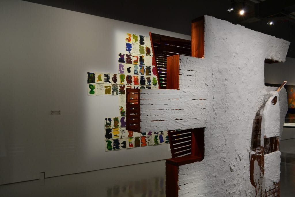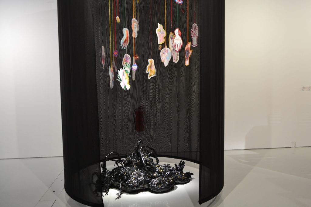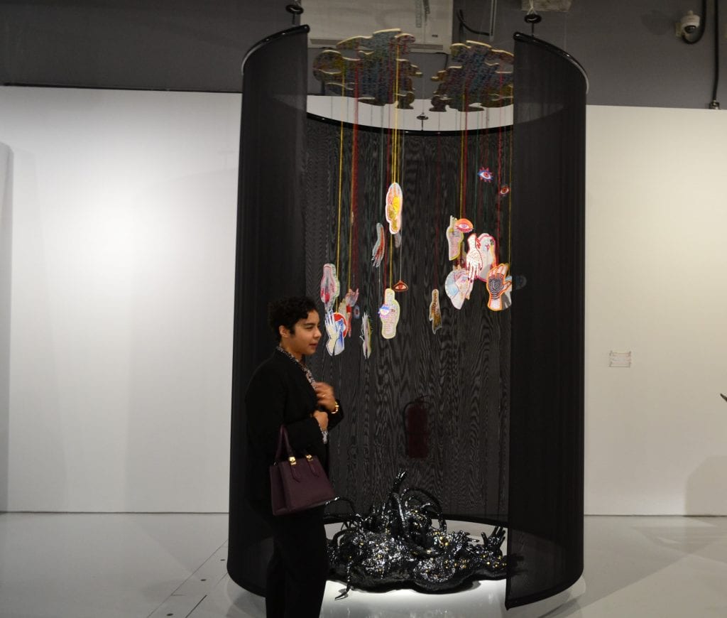 From Ala’s recurrent lines we move to Nourbanu Hijazi’s Demons, an installation that explores parallels between the perception of the paranormal and mental illness in the context of Arabic Islamic society. Palestinian artist from Saudi Arabia, Nourbanu Hijazi’s artworks aim to explore the human condition, specifically internal conflicts and mental illness. Nourbanu’s work is indeed haunting with a demon conceptualised and brought to art through steel wires, plaster, acrylic, and clay. The brain is conceptualised as a hemisphere with cardboard cut-outs from her personal journal hanging down from a string.