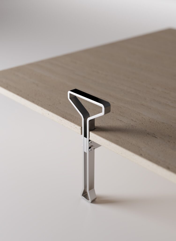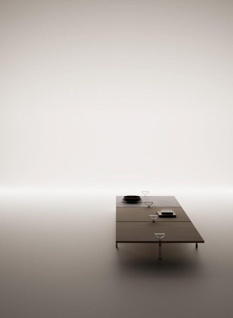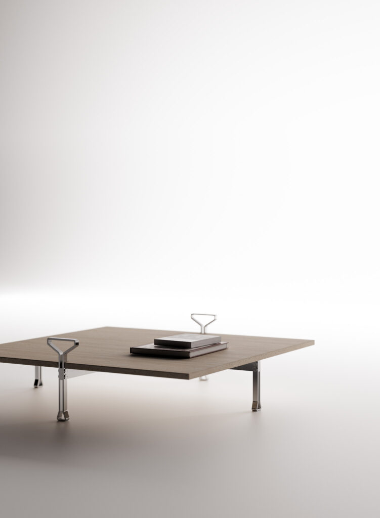 Its design is governed not by decoration but by structural reasoning. Integrated side handles—resolved as part of the table’s load-bearing logic—facilitate movement while transforming a functional necessity into a recognisable architectural sign. Here, gesture and structure coincide.